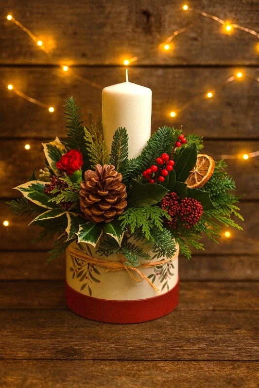 Bring a touch of Christmas enchantment into your home with this festive candle arrangement. Filled with lush evergreens, holly, berries, pinecones, and a classic pillar candle, it captures the cosy magic of the season. Perfect as a table centrepiece or a charming gift, it adds a warm, glowing touch of Christmas wonder to any space.