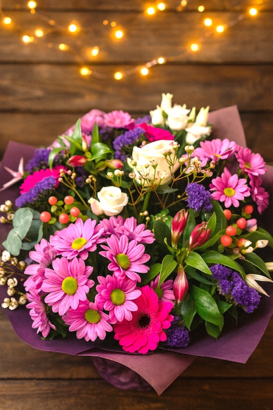 Bursting with vibrant pinks, purples, and soft winter whites and a touch of sparkle, Sugar Plum is a playful and enchanting hand-tied bouquet that brings a touch of Christmas whimsy to any home. Filled with cheerful blooms, rich textures, and seasonal foliage, it’s the perfect choice for adding colour, joy, and a sprinkle of festive magic to the season