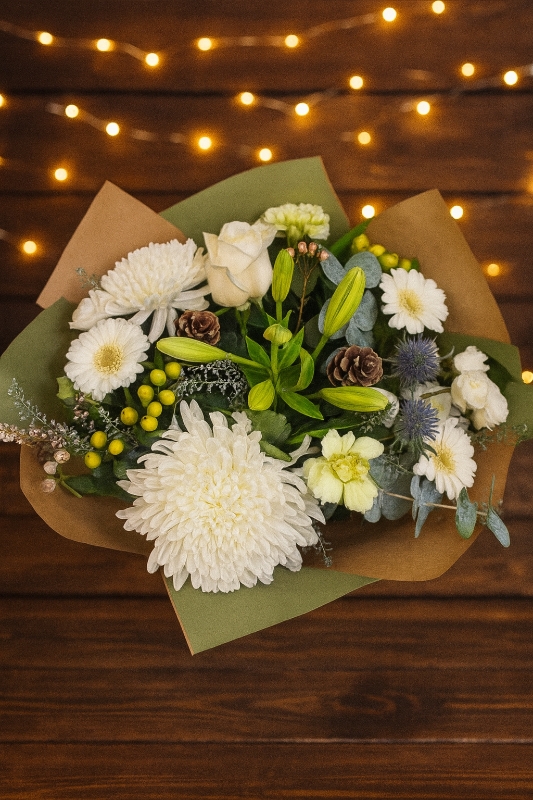 A serene blend of crisp whites, soft greens, and natural textures, this winter hand-tied captures the peaceful beauty of the season. Featuring delicate blooms, festive foliage, charming pinecones and a hint of Silver, it brings a touch of quiet luxury to any space. Perfect for gifting or adding a calm, wintry elegance to your home
