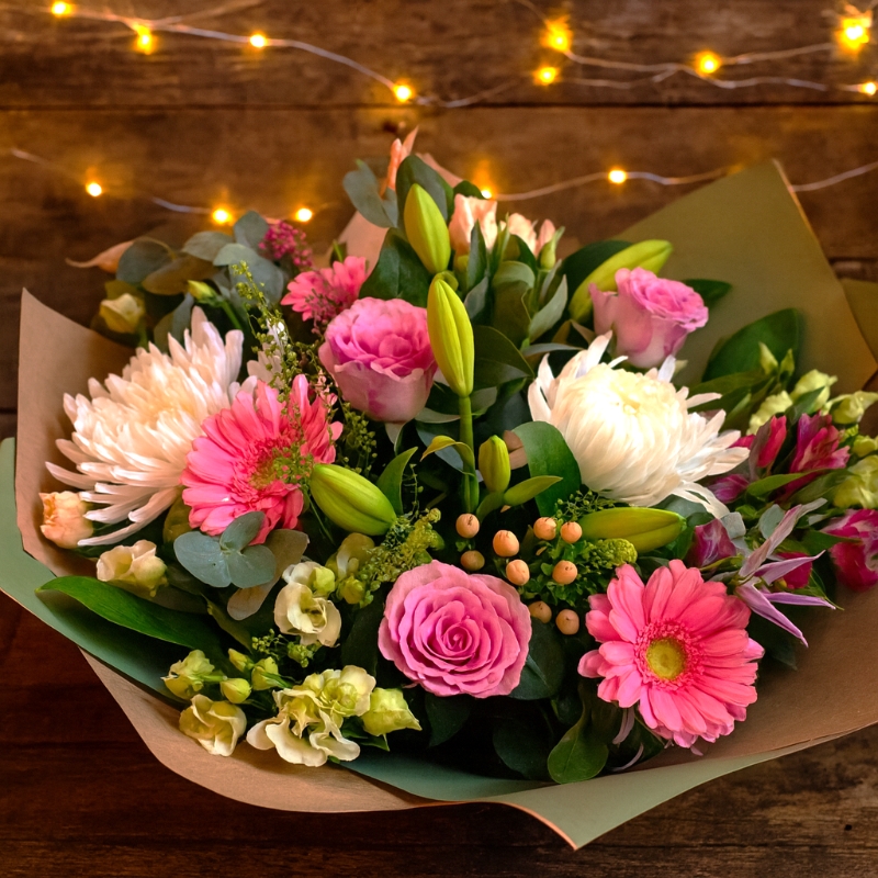 Bright, cheerful, and full of festive charm, this hand-tied bouquet blends vibrant pink blooms with soft winter whites and lush seasonal foliage and an added touch of sparkle. Its fresh, joyful colour palette adds a modern twist to Christmas gifting, making it the perfect choice for bringing warmth, positivity, and a touch of Christmas magic into any home.