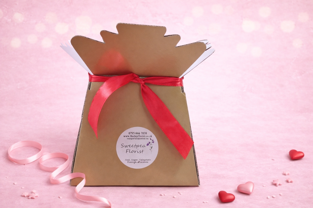 24 Luxury Rwd Roses hand tied with delicate White Wax Flower and soft,complimentary Foliage. Beautifully presented in a gift box.