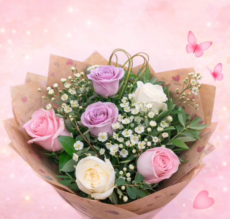 The Rose Garden is a classic Mother’s Day hand-tied bouquet featuring pink, lilac and ivory roses with fresh seasonal greenery. Romantic, elegant and timeless, it’s the perfect gift for Mum.
